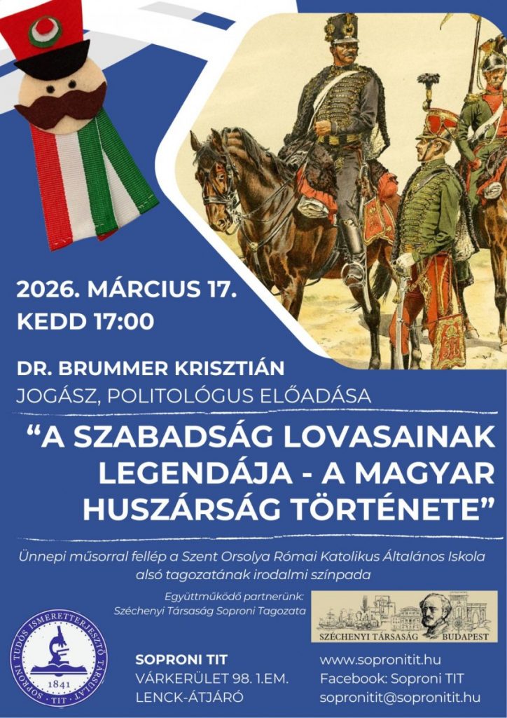 A magyar huszár nem pusztán egy katonai fegyvernem, hanem a magyar történelem egyik napjainkban is élő, meghatározó jelképe. Bátorság, gyorsaság, cselvetés és elegancia egyesül benne a hazaszeretettel. Története a végvári portyáktól, a 48-as legendás huszárokon át a második világháborúig tart. A huszárság története több mint ötszáz évet ölel fel, és messze túlnő Magyarország határain, hiszen Európa nagy hadseregei mind átvették ezt a sajátosan magyar harcmodort. Az előadás bemutatja, miként vált a huszár a nemzeti identitás egyik legerősebb szimbólumává, hogyan születtek a híres hőstettek és miért mondható, hogy a huszár „sokkal több mint katona”. Szó esik arról is, hogy a huszárság nemcsak a harctéren, hanem a magyar közéletben is meghatározó szerepet játszott, hiszen huszár volt többek között gróf Széchenyi István, gróf Batthyány Lajos vagy gróf Tisza István is. A TIT-előadás arra keresi a választ, hogyan lett ebből a könnyűlovas harcosból nemzeti ikon, és miért dobban meg ma is a szívünk ha magyar huszárt látunk.